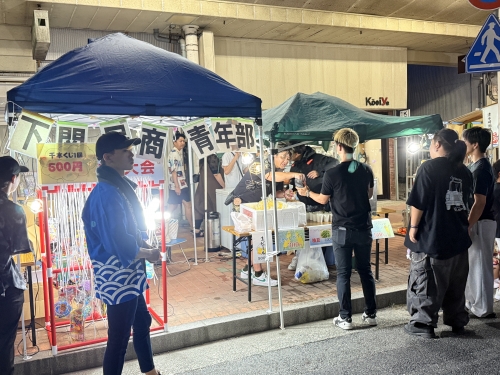 今年は唐戸夜市でしている『千本つりくじ』に『冷やしパイン』『生ビール』『枝豆』